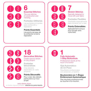 The HD4432 is equipped with 32 built-in stitches that are shown on the convenient stitch selector dial, including essential, stretch, and decorative stitches. This machine has an adjustable stitch width of (6mm) and an adjustable stitch length, with three different needle positions. With a fully automatic one-step buttonhole feature, you can also add buttonholes to pants, shirts, jackets, and more.