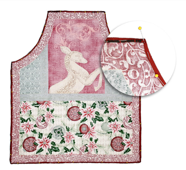 - Pin the pocket to the apron front at placement markings and make sure to match pattern lines.