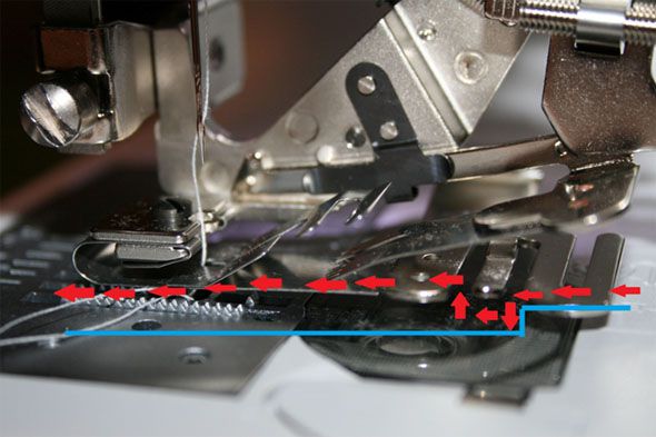 Ruffle Setting: 1 - Stitch Length: 3.0 / Ruffle Setting: 1 - Stitch Length: 5.0 Pretty awesome, huh? Just like a Gathering Foot, you can join a 'flat' piece of fabric to the ruffled fabric. You slide the fabric in just as you do normally. Then you slide in the straight piece of fabric beneath the fabric to be ruffled. Follow the blue line for the straight piece of fabric. This may take a little bit of wiggling and maneuvering to get everything in correctly.