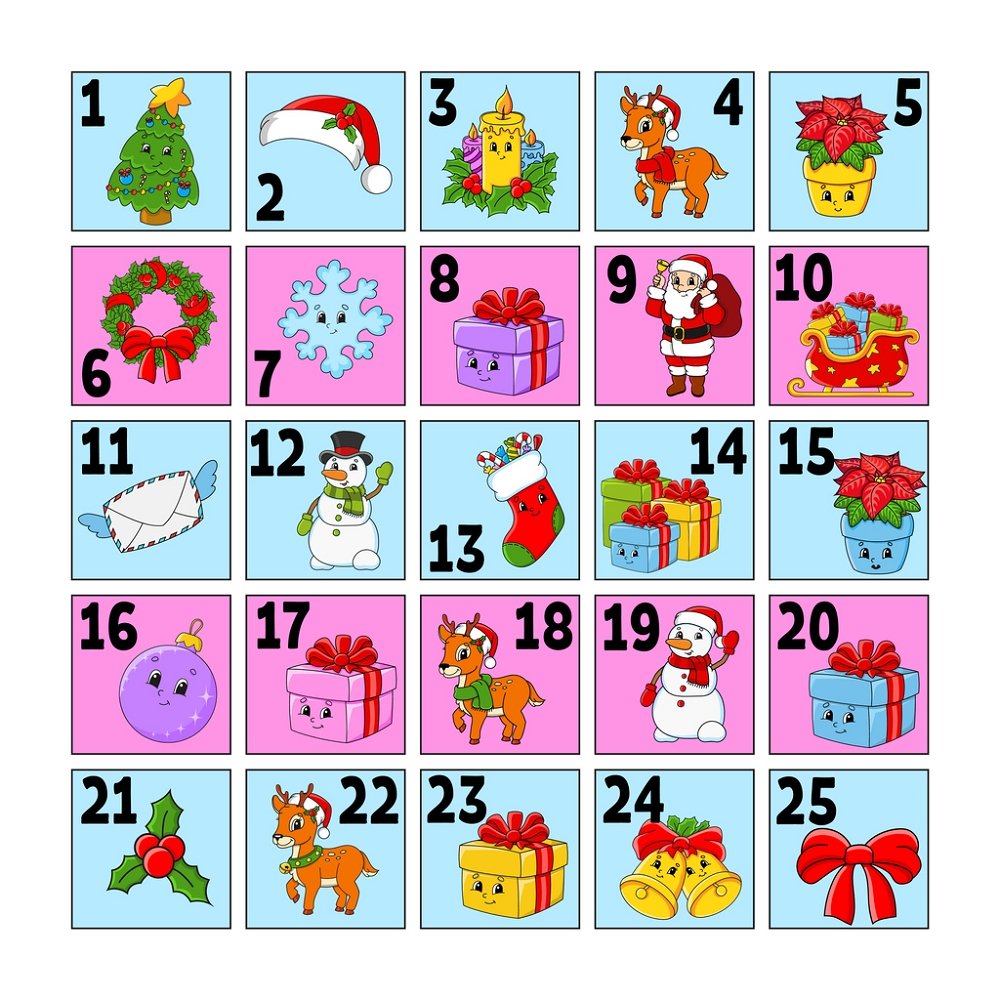 Cartoon Christmas Advent Calendar Fabric Panel - Blue/Pink