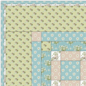 The Spring Time Daisies Quilt Kit includes everything you need to make the quilt - the instructions, 15 panels, and a total of 11 yards of fabric for sashing, flange binding, and backing. The quilt kit features an assortment of Spring Time Daisies Collection prints with panels and Single Irish Chain blocks. Set in a grid pattern with sashing and cornerstones, with a border and flange binding. Batting is sold separately. The finished size of this quilt is 63 1/2" x 74".
