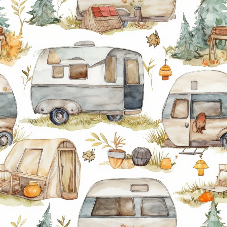 The Watercolor Camping Pattern 1 Fabric is printed by Sew Creative Fabrics. Digitally Printed on 100% cotton.