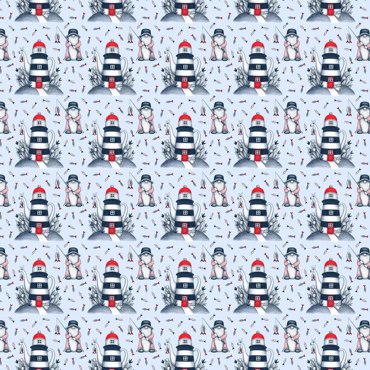 The Blue Fishermen Gnome At Sea Fabric is part of the Gnomes At Sea Fabric Collection printed by Sew Creative Fabrics. Digitally Printed on 100% cotton.