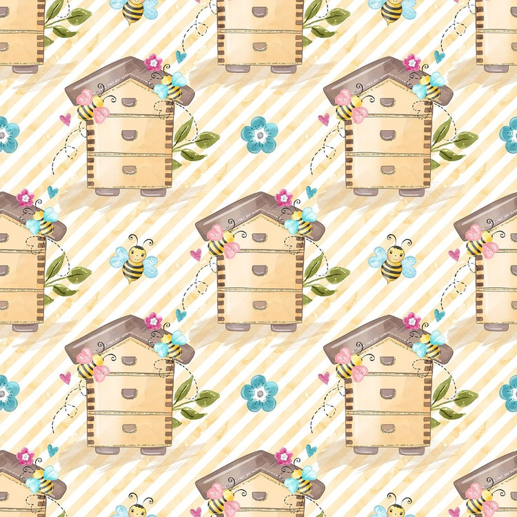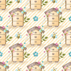Honey Bee Colony & Stripes Fabric - White/Yellow Details