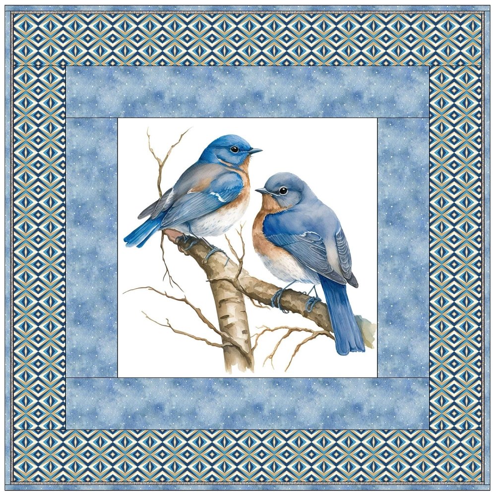 The Bluebirds on a Branch Wall Hanging includes everything that you need to make the quilt - the instructions and a total of 4 yards of fabric and a 23" panel. It has two borders and is finished with a flange binding. Batting is sold separately. The finished size of this quilt is 42" x 42".