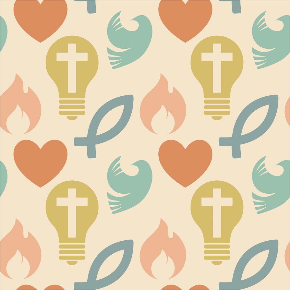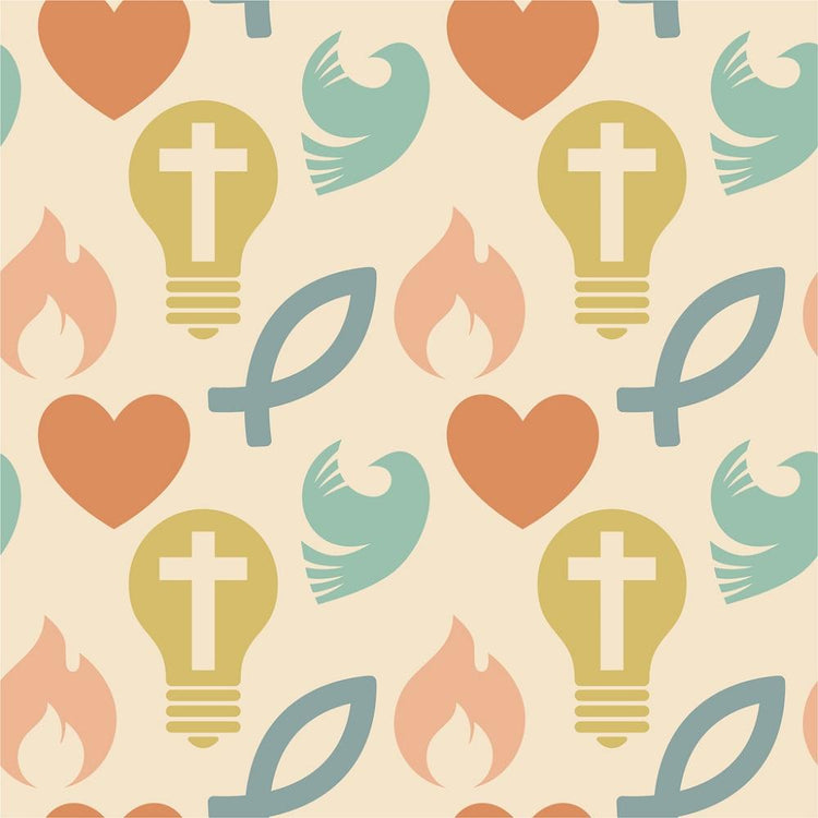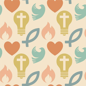The Tan Vintage Christian Symbols Fabric is part of the Saved By Grace Fabric Collection printed by Sew Creative Fabrics. Featuring light bulbs, fish, doves, flames and hearts. Digitally Printed on 100% cotton.