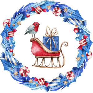 Bird on Sleigh in a Wreath Fabric Panel - Blue