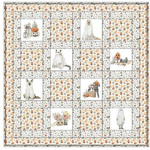 The Watercolor Halloween Still Life Quilt Kit includes everything you need to make the quilt - the instructions, 8 fabric panels, and a total of 9 yards of fabric for sashing, flange binding, backing, and cornerstones. Batting is sold separately. Set in a grid pattern with sashing and cornerstones, with a border and flange binding. The Watercolor Halloween Still Life Quilt Kit uses a combination of fabrics from the Watercolor Halloween Still Life Collection. Finished with a flanged binding. The finished size of this quilt is 58 1/2" x 58 1/2".