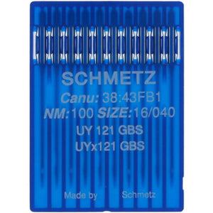 Schmetz UYx121 GBS Needles is a pack of ten needles in a plastic case.
