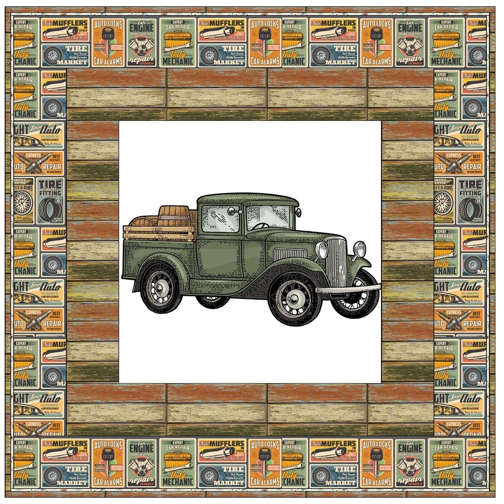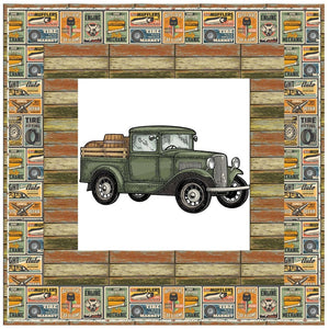 1930's Pickup Truck Poster Wall Hanging includes everything that you need to make the quilt - the instructions and a total of 3 1/2 yards of fabric and a 23" panel. It has two borders and is finished with a flange binding. Batting is sold separately. The finished size of this quilt is 42" x 42".