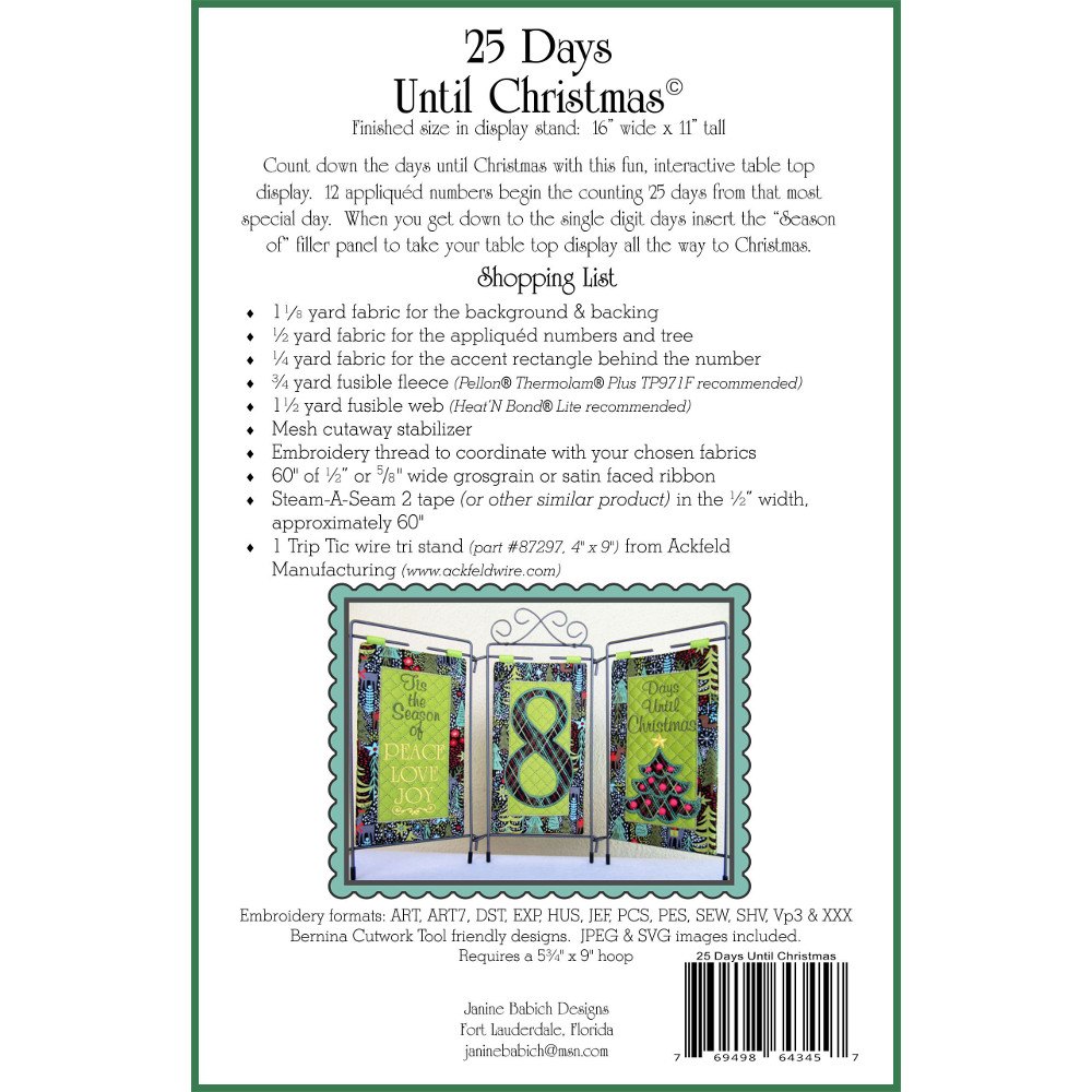 Count down to Christmas day with this 25 Days Until Christmas tabletop display. The 25 Days Until Christmas, Christmas Countdown is easy and fun to make and can be used every year. The embroidery CD includes the following formats: ART, ART7, DST, EXP, HUS, JEF, PCS, PES, SEW, SHV, VP3 & XXX. Also included are JPEG and SVG images. The 25 Days Until Christmas, Christmas Countdown measures 16-inches wide by 11-inches tall when completed. This pattern requires the use of a 5-3/4in by 9in machine embroidery hoop. Proudly display your Christmas countdown on the Table Top Tri-Stand Quilt Hanger.