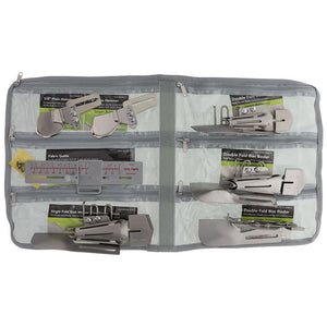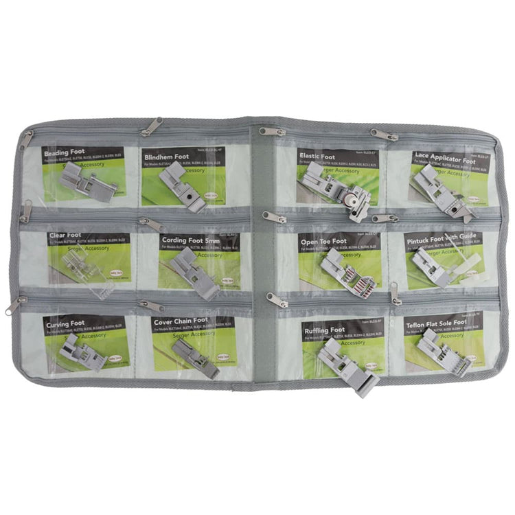 You can further expand your serger's creative capabilities with these 29 feet. From working with lace and elastic to stitching curves and creating perfectly straight hems, this foot kit allows you to make all of your sewing dreams a triumphant reality. Kit includes Beading Foot, Belt Loop Binder 3/4", Belt Loop Binder 1-1/2", Blindhem Foot, Clear Foot, Cording Foot 5mm, Cover Chain Stitch Foot, Curving Foot, Double Fold Bias Binder 28mm, Double Fold Bias Binder 36mm, Elastic Foot, Fabric Guide, Knit/Woven Double Fold Bias Binder 8mm, Knit/Woven Double Fold Bias Binder 10mm, Knit/Woven Double Fold Bias Binder 15mm, Lace Applicator Foot, Open Toe Foot, Pintuck Foot, Piping/Cording Foot 5mm, Plain Hemmer 1/4", Plain Hemmer 1/2", Quilt Guide, Ruffling Foot, Single Downturn Feller 1/4", Single Downturn Feller 5/8", Single Downturn Feller 1", Single Fold Bias Binder 28mm, Single Fold Bias Binder 40mm, Single Fold Bias Binder Knit/Woven 15mm, and Teflon Foot. To see a brief overview of each foot and how to use it, download the instructions here.