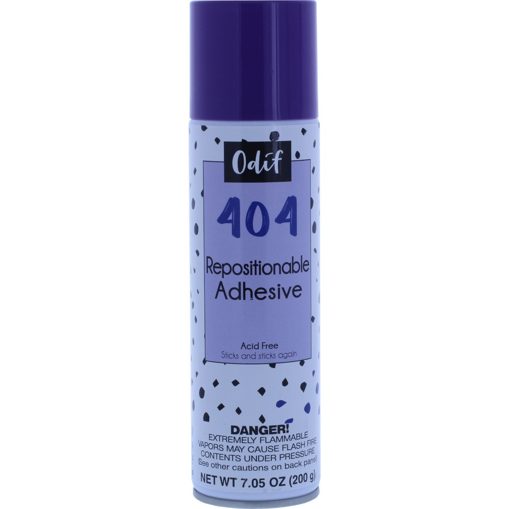 404 Spray & Fix makes everything act like a sticky note. It holds securely but can be repositioned again and again. It's perfect for holding stencils, artwork, photos, paper and fabric collages to any surface. Odif's 404 Spray will not transfer or gum needles. Acid-free and cleans up with rubbing alcohol. In each can of 404 Spray & Fix, there are 7 fluid ounces.