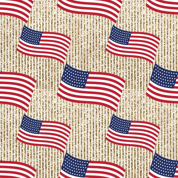 The 4th of July Flags on Stripes Fabric is part of the 4th of July Fabric Collection, printed by Sew Creative Fabrics. It is digitally printed on 100% cotton and measures 42-45" wide.