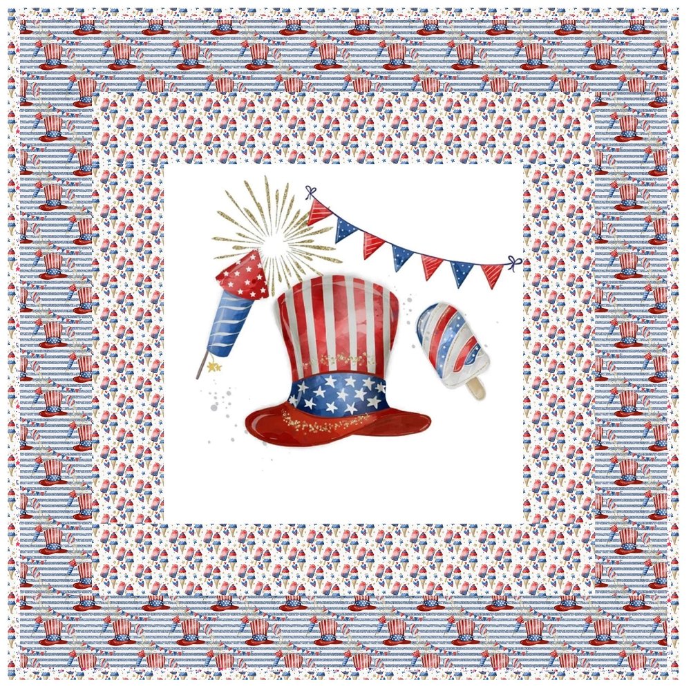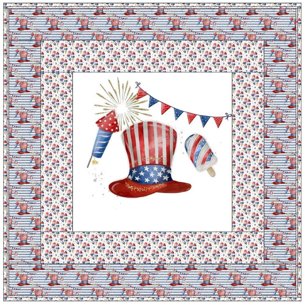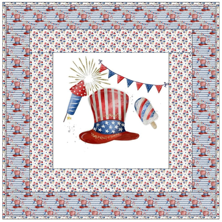 The 4th of July Party Wall Hanging includes everything that you need to make the quilt - the instructions and a total of 4 yards of fabric and a 23" panel. It has two borders and is finished with a flange binding. Batting is sold separately. The finished size of this quilt is 42" x 42".