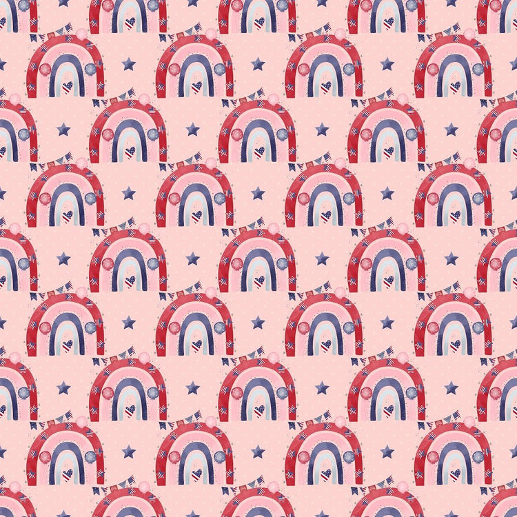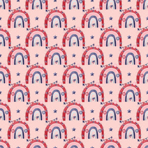 The Red 4th of July Rainbows Fabric is part of the 4th of July Gnomes Fabric Collection, printed by Sew Creative Fabrics. It is digitally printed on 100% cotton and measures 42-45" wide.