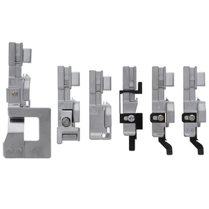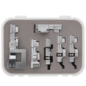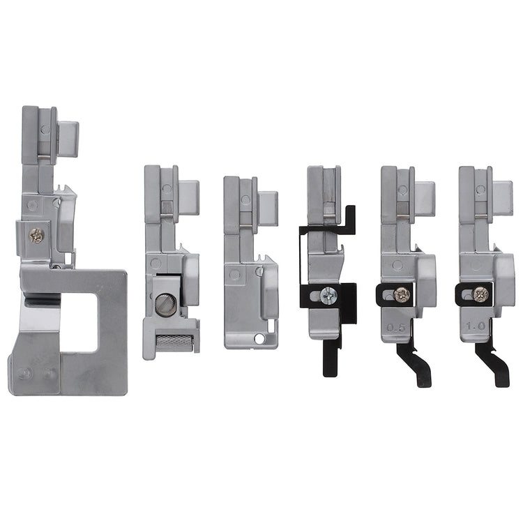 Do more creative techniques with your serger when you add additional feet. Includes 0.5mm Blind Hem Foot, 1mm Blindhem Foot, Cording Foot, Elastic Foot, Beading Foot and Ruffling Foot.