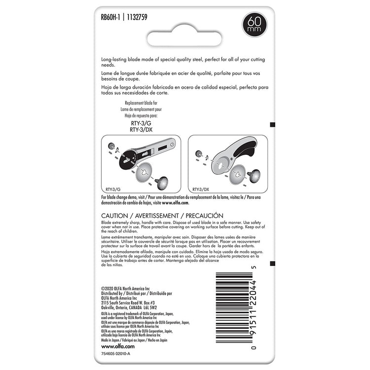 Olfa's 60mm Endurance Rotary Blade is a high-performance blade that lasts twice as long as a standard rotary blade. Effortlessly cut through multiple layers of fabric with precision. Olfa's 60mm Endurance Rotary Blade fits most Olfa brand rotary cutters that use a 60mm blade.