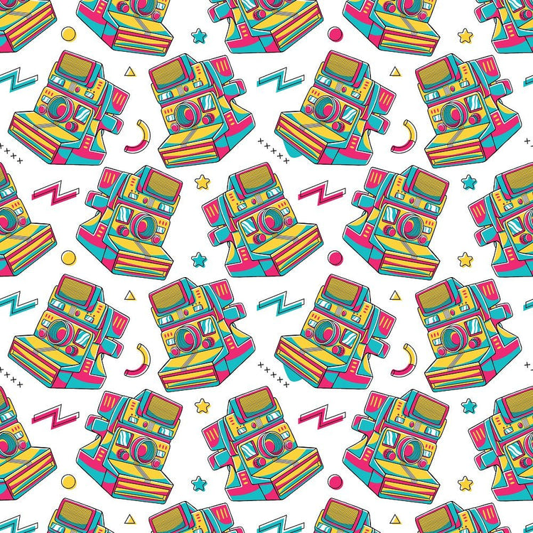 The White 90s Vibe Vintage Cameras Fabric is part of the 90s Vibe Fabric Collection printed by Sew Creative Fabrics. Digitally Printed on 100% cotton.