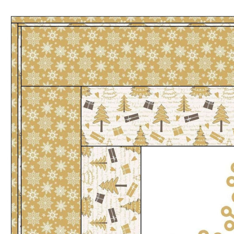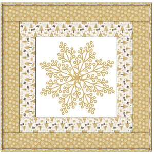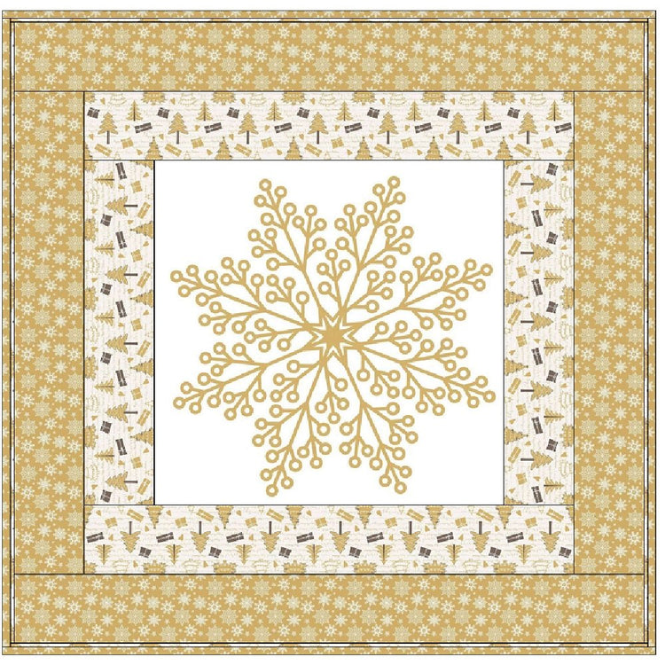 The Golden Christmas Wall Hanging includes everything that you need to make the quilt - the instructions and a total of 3 1/2 yards of fabric and a 23" panel. It has two borders and is finished with a flange binding. Batting is sold separately. The finished size of this quilt is 42" x 42".