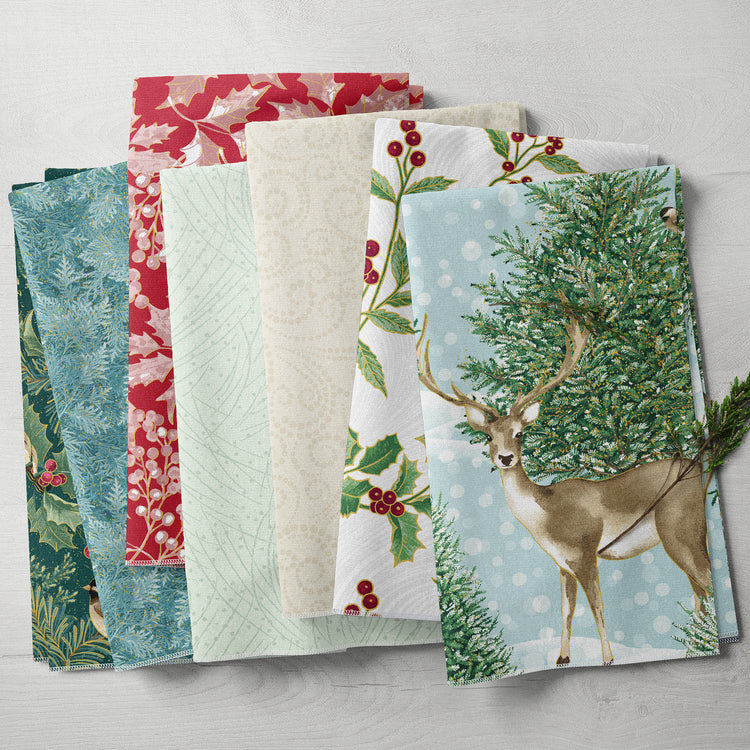 Capture the peaceful magic of the season with A Winter's Day, a breathtaking fabric collection designed by Jackie Robinson for Benartex Fabrics. Inspired by the snowy forests surrounding Jackie's home in Arizona's White Mountains, this collection features graceful deer, sparkling evergreens, delicate holly, and soft textures that evoke the still beauty of winter. Many prints are enhanced with shimmering metallic gold for a festive, elegant touch that adds depth and light to your projects.