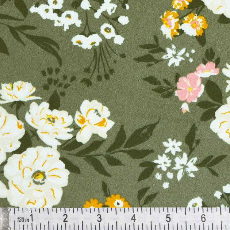 a charming and cozy choice for quilters, featuring soft ivory and pale yellow blossoms accented by delicate pink and golden-orange flowers against a warm, earthy olive-green background. The floral design has a hand-painted look, adding an organic, vintage feel that is perfect for nature-inspired or cottagecore quilts. The muted color palette brings a sense of warmth and tranquility, making this fabric ideal for autumn or winter projects. Its flannel texture enhances its coziness, making it a wonderful choice for quilts that provide comfort and warmth.