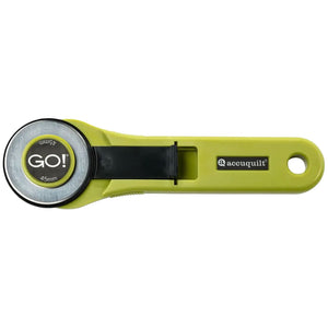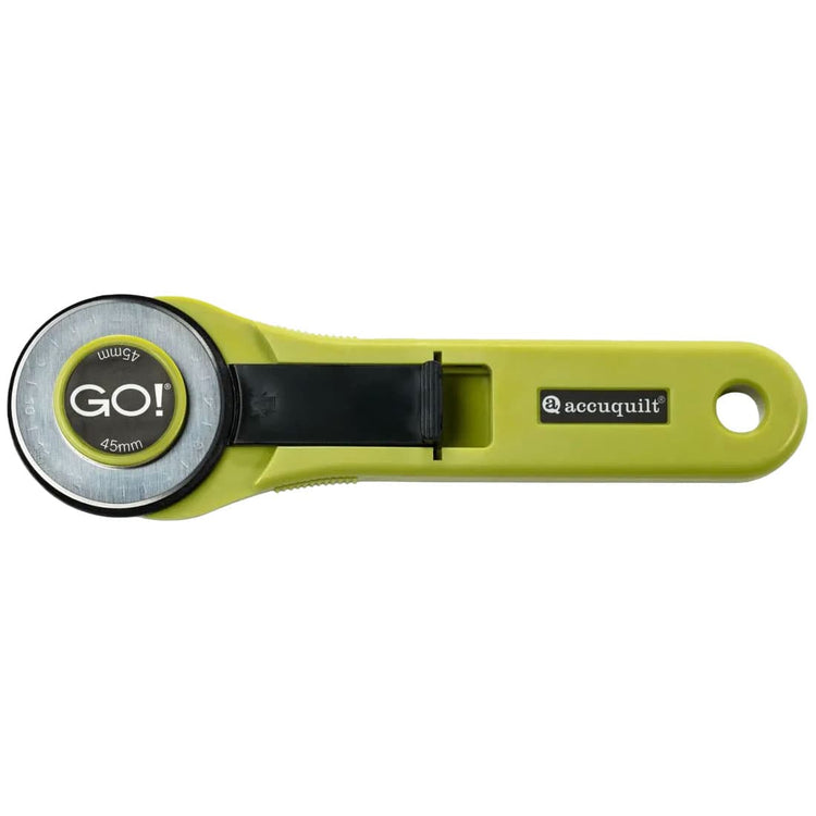 The Accuquilt GO! 45mm Rotary Cutter is designed for right and left-hand use, featuring a high-speed steel blade with a safety lock for protection. This Accuquilt GO! 45mm Rotary Cutter is excellent in combination with the GO! Rotary Cutting Mats for pre-cutting strips to place in the AccuQuilt GO! Fabric Cutting Systems.