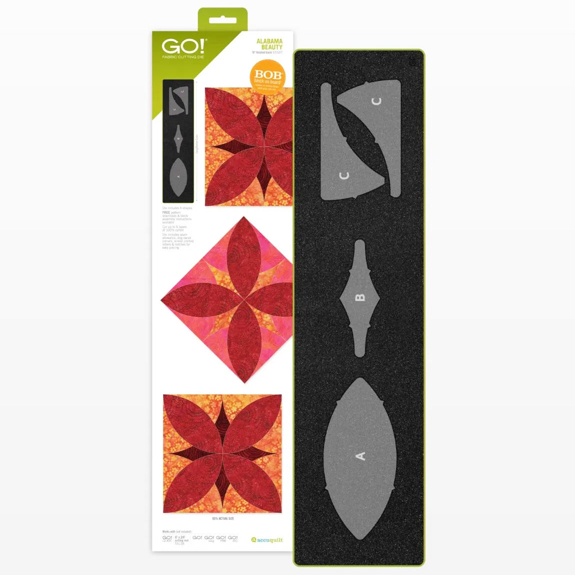 Some shapes can be difficult to cut accurately by hand, but the Accuquilt GO! Dies provide precise cuts every time. The Accuquilt GO! Alabama Beauty Die (10" Finished) is a Block on Board® (BOB®) die specifically designed to cut a 3-color, 10" block in a single pass through the cutter. It features 4 challenging shapes, specialized dog ears, 1/4" seam allowances, and notches on curves to ensure easy alignment. This die also features screen-printed letters on the die foam for easier piecing and shape organization. The Accuquilt GO! Alabama Beauty Die (10" Finished) is perfect for using fabric scraps that would otherwise go to waste and is fat-quarter-friendly. The Accuquilt GO! Cutting Mat 6" x 24" is required.