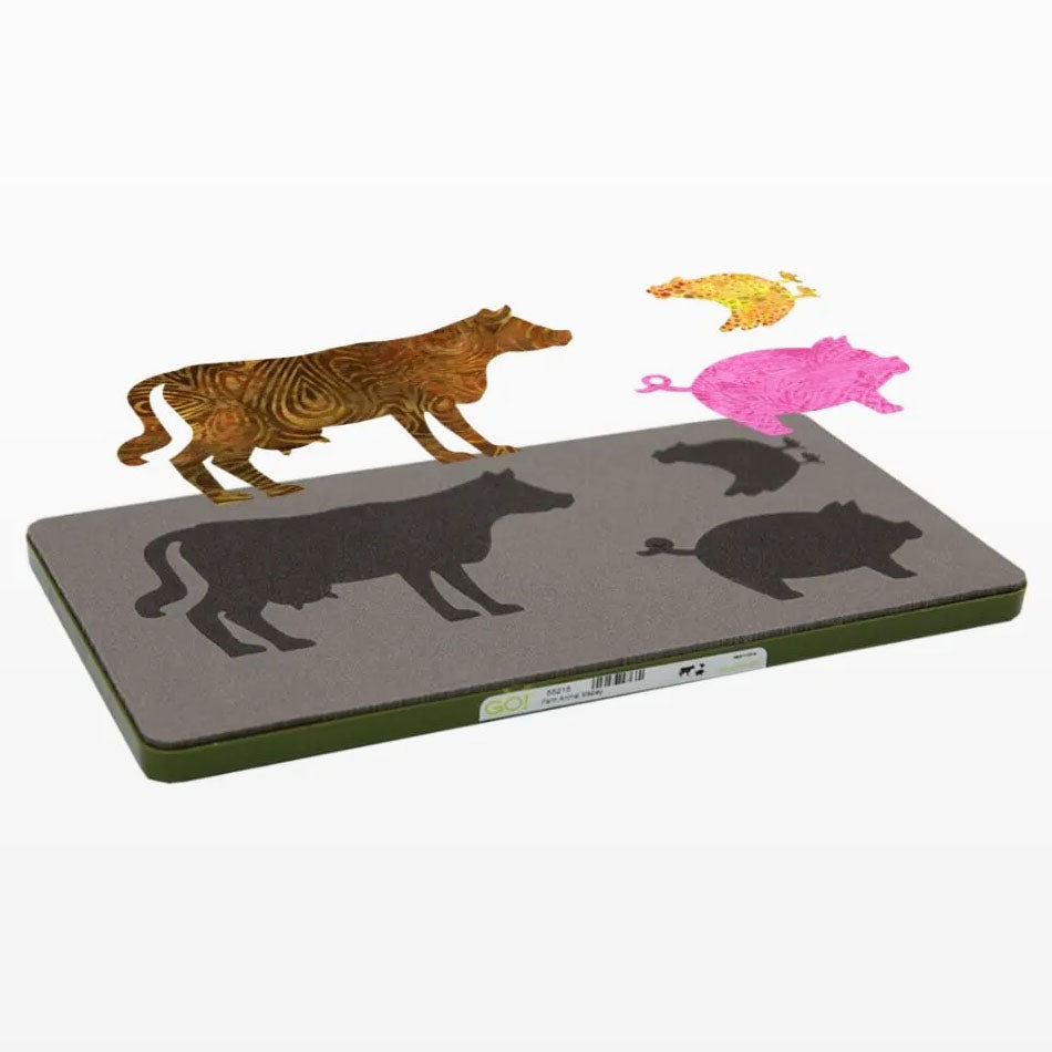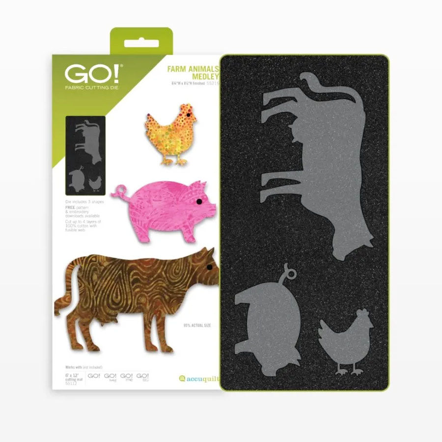 The Accuquilt GO! Farm Animals Medley Die features adorable farm animal shapes that will certainly open the barn door to creativity! Add some farmhouse style to your quilt tops, wall hangings, aprons, and home decor with cows, pigs, and chickens. Combine this die with others like the GO! Western Medley Die or the GO! Tractor Die to tie the look together. The Accuquilt GO! Farm Animals Medley Die is a perfect way to use fabric scraps that would usually go to waste, and it's also fat-quarter-friendly. The Accuquilt GO! Cutting Mat 6" x 12" is required.