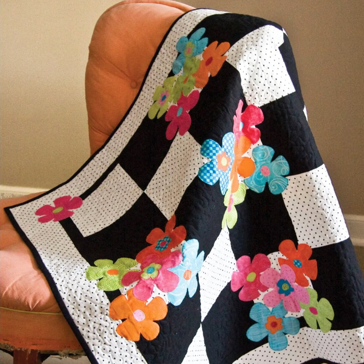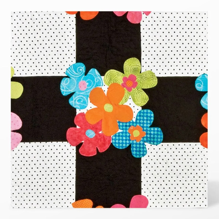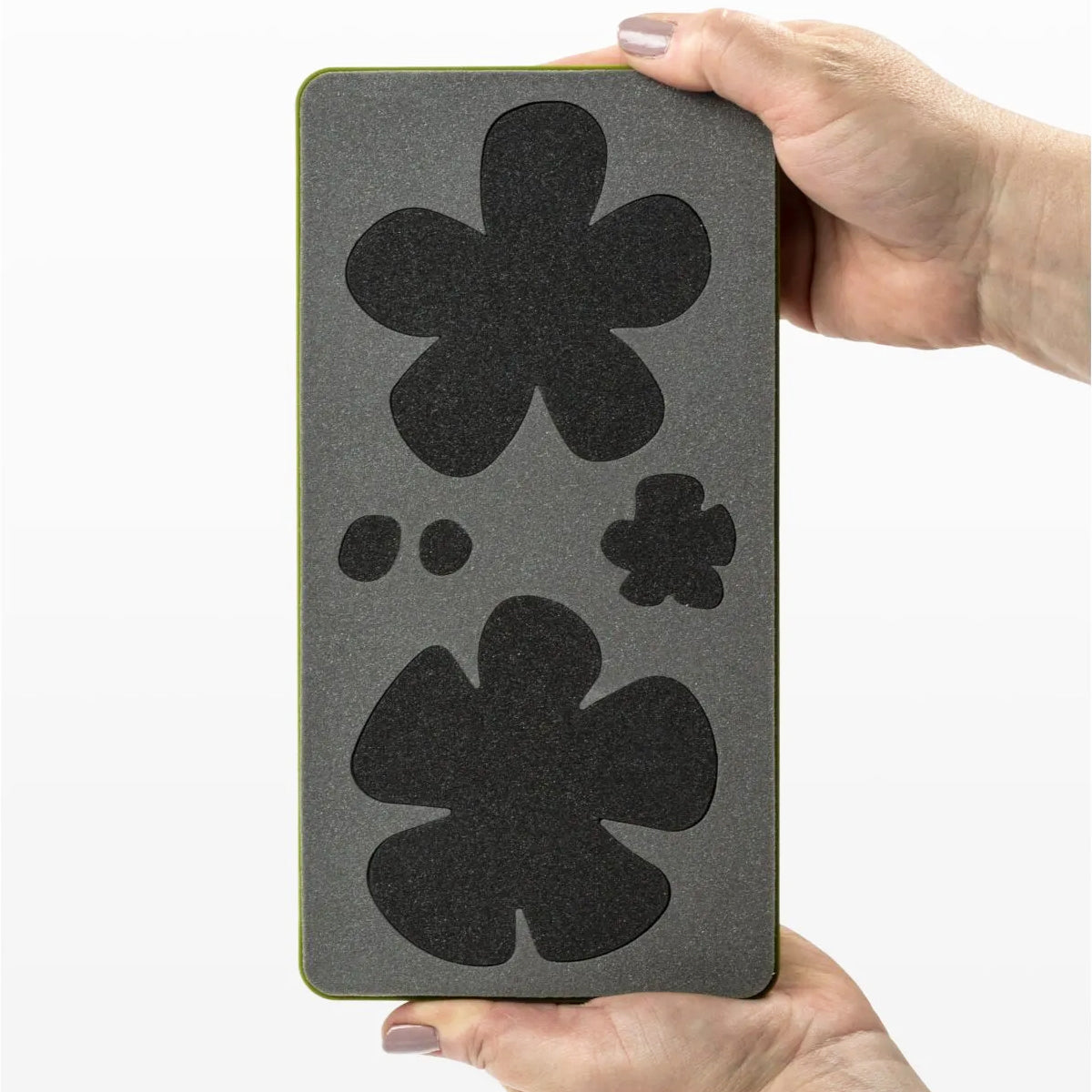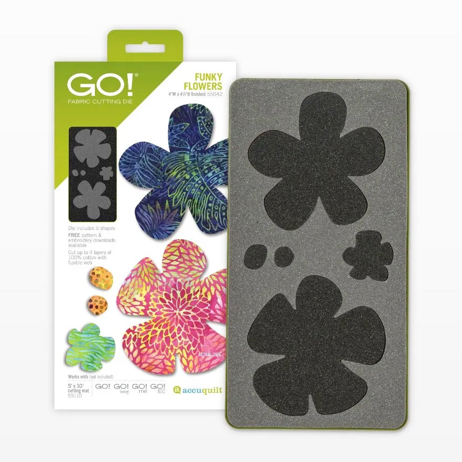 The Accuquilt GO! Funky Flowers Die features two large flowers, one small flower, and two flower centers. Experiment with fabric prints, creating diverse styles from simple to funkadelic!