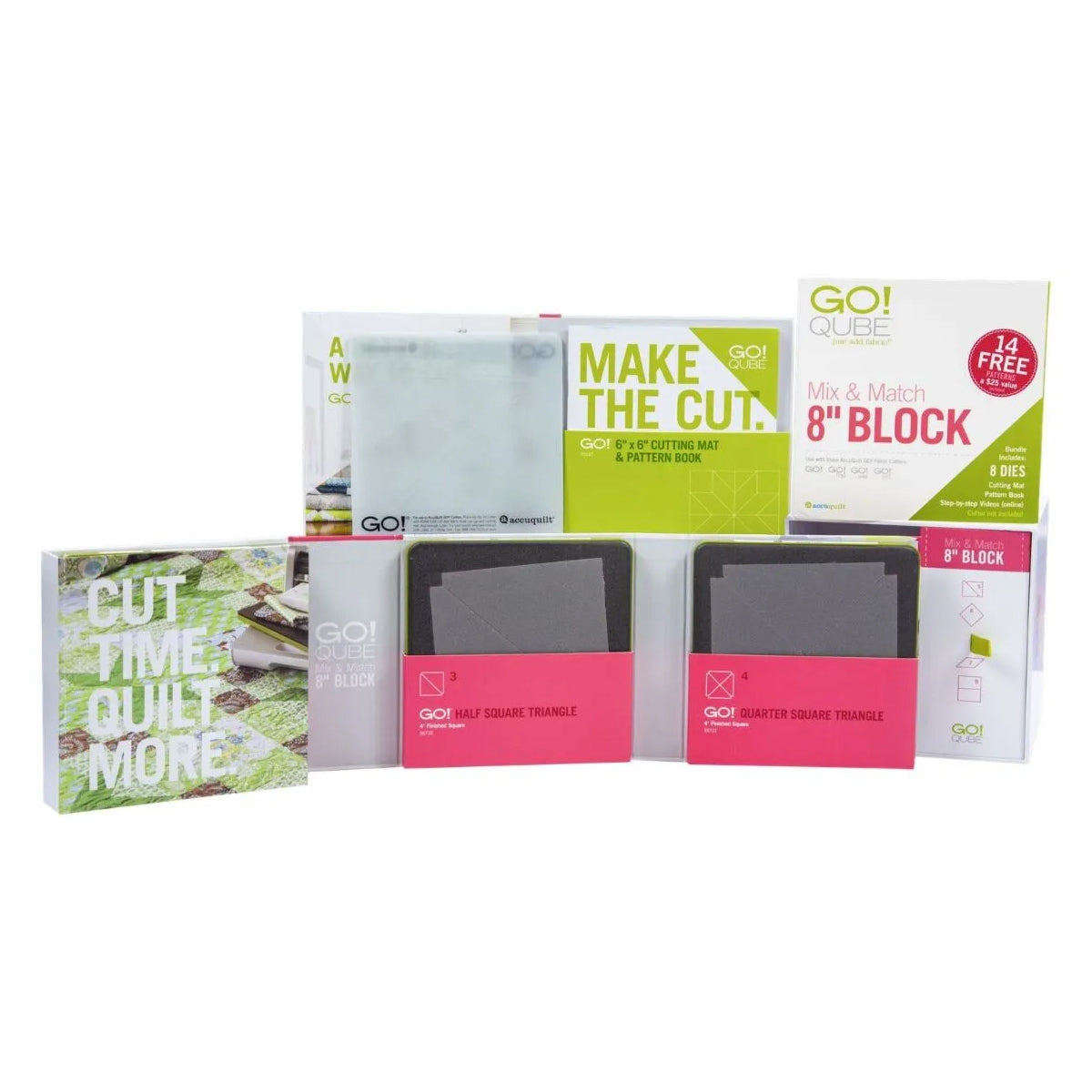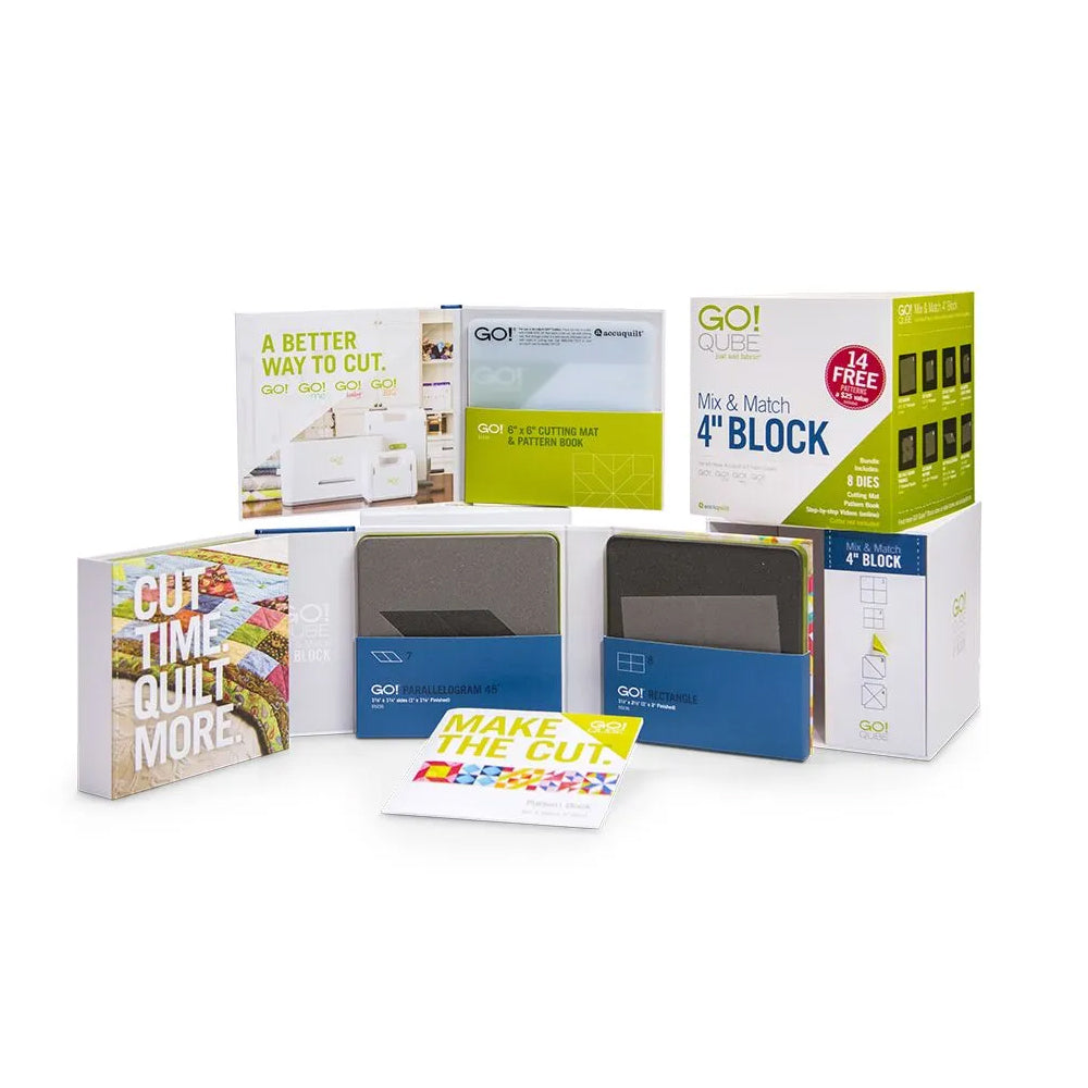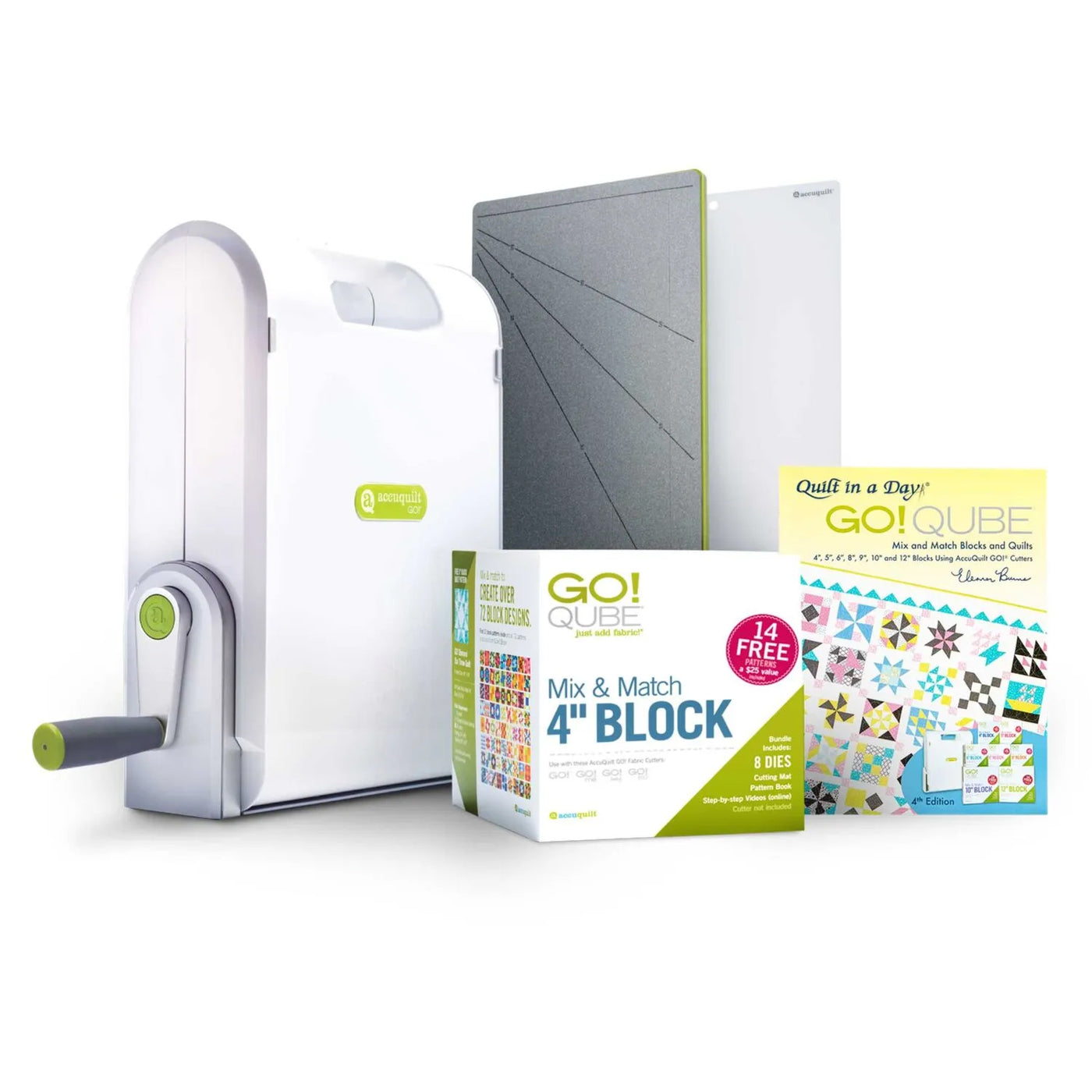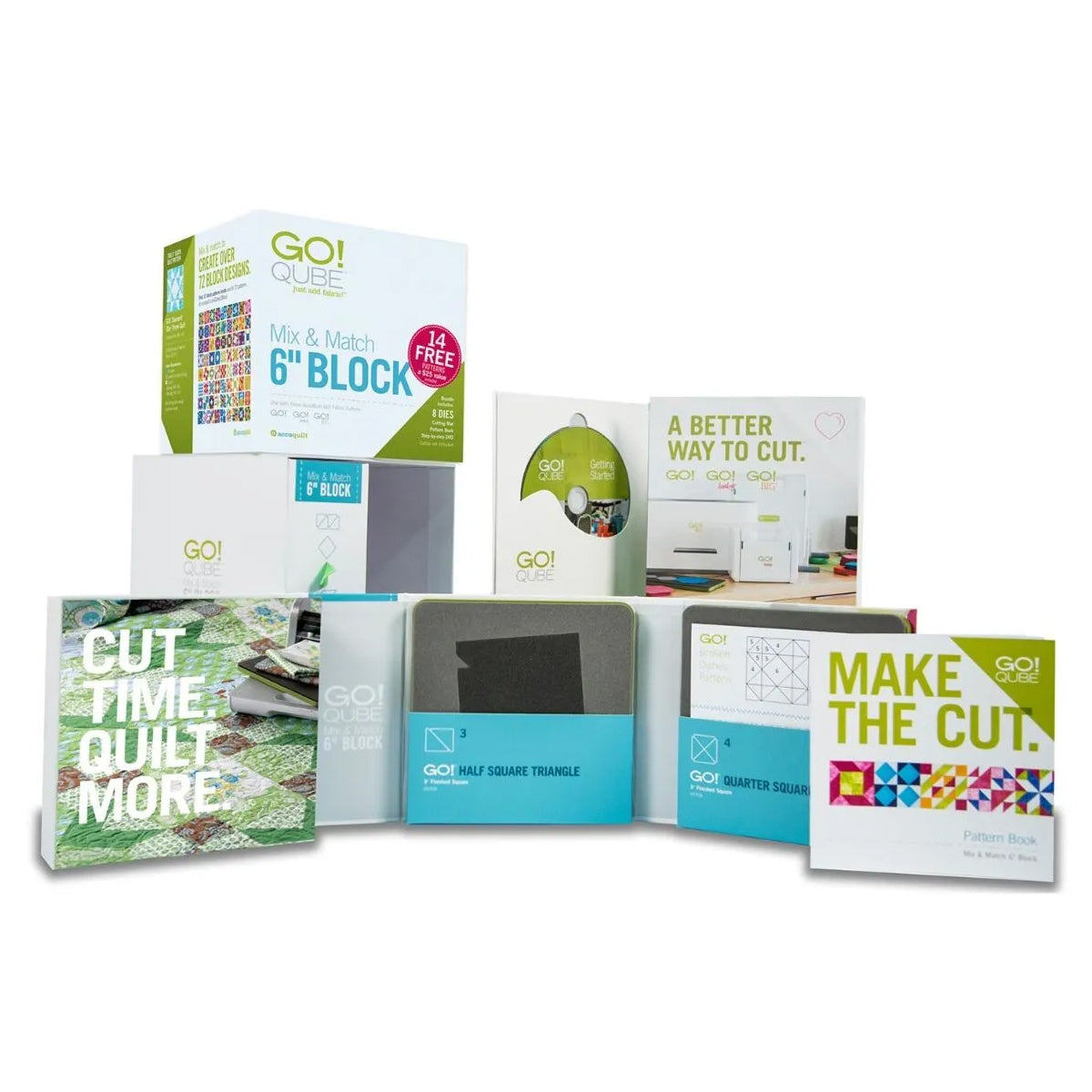 The Accuquilt Ready. Set. GO! Ultimate Fabric Cutting System includes an easily instructed Pattern & Idea Book that features 2 ready-to-create quilt patterns using the included dies, GO! Qube Mix & Match Block Pattern Book with 9 Block Patterns & 1 Quilt Pattern, and the GO! Qube Mix & Match Blocks and Quilts Pattern Book with 46 Block Patterns and 16 Quilt Projects. Mixing and matching shapes can give infinite design opportunities!