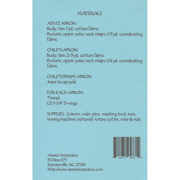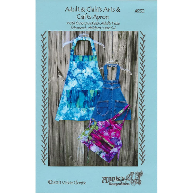 Keep your clothes protected while cooking or crafting with Annie's Adult & Child's Arts & Crafts Apron Pattern. This simple pattern includes instructions on an adult-sized apron (one size fits most) and a kid's apron in sizes small through large. All sizes feature large front double pockets, back waist ties, and adjustable neck straps. Use cotton, batiks, or denim to make the Adult & Child's Arts & Crafts Apron.