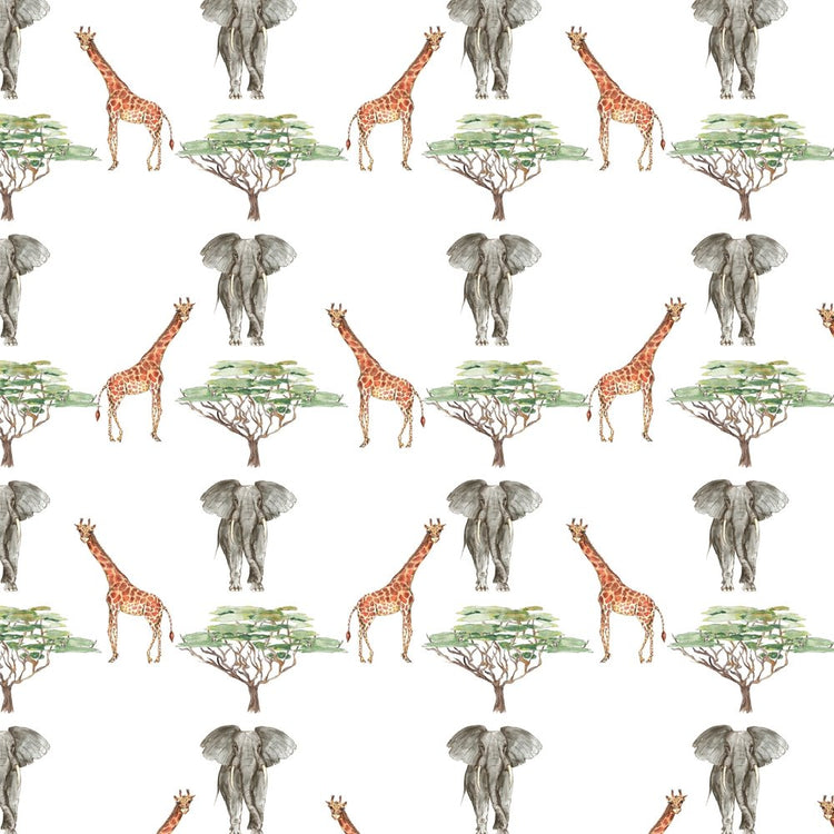 African Giraffes & Elephants Fabric - White