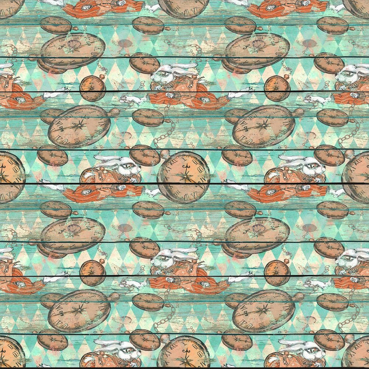 The Blue Alice in Wonderland Clocks on Wood Fabric is part of the Alice in Wonderland Volume 2 Fabric Collection printed by Sew Creative Fabrics. Digitally Printed on 100% cotton.