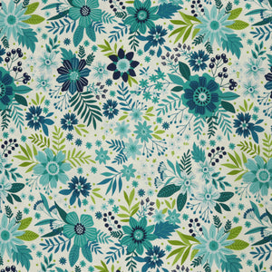 Wildflowers Lake is a fresh and vibrant print that feels like a deep breath of spring air by the water’s edge. Lively florals in shades of aqua, turquoise, leafy green, and navy bloom against a soft cream background, creating a playful yet sophisticated tapestry of color. With a delightful variety of blossoms, branches, and berries scattered across the design, the print has a whimsical rhythm that brings movement and life to any project. The cooler tones are balanced beautifully with pops of bright green, adding a lighthearted contrast that makes the pattern dance. Whether used as a focal point or a dramatic backing, Wildflowers Lake offers a refreshing twist on the classic floral style.