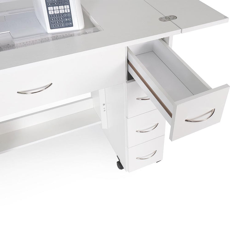 Organize your notions and fabric within the four easy-glide drawers. Each drawer measures 5" wide by 15-3/8" deep, so they have enough room to hold thread, notions, fabric, crafts, and other necessities. Please note the notions pictured with Alice are not included.
