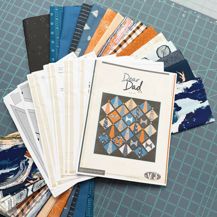 This kit includes the Dear Dad exclusive quilt pattern and all the AGF premium cotton needed for the quilt top and binding. Instructions feature ¼" seam allowances for accuracy and ease. Please note: backing and batting are not included, allowing you to finish it your way. Whether you're sewing for Father's Day, a birthday, or to say "thank you," this quilt is a heartfelt gift stitched with love. Also, don't forget to check out the Dear Mom Quilt Kit so you have coordinating keepsakes for both parents. Please note fabric styles may vary depending on availability.