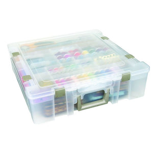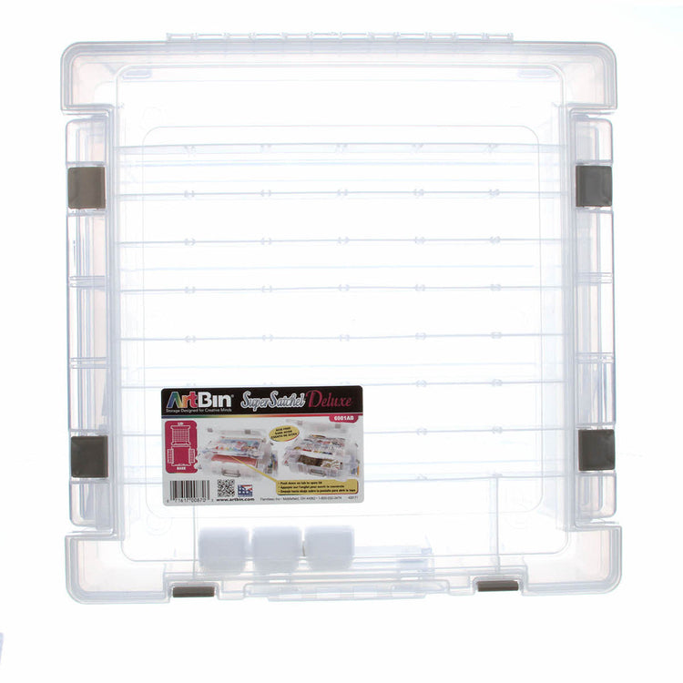 Customize your storage space with ArtBin's Super Satchel Deluxe Tote with Divided Lid. This large tote features two side bins with both fixed and removable dividers, the top tray has more removable dividers, and the bottom compartment is just an open area. Each compartment can be opened individually, so you do not have to dig through everything to get to one item. You can also see through the Super Satchel Deluxe Divided Tote so you can quickly find what you are looking for. All of ArtBin's products have been made in the USA and molded using acid-free polypropylene. Tote measures 17-1/4" x 16-3/4" x 5".