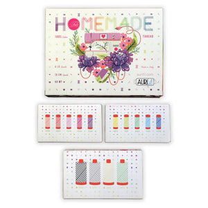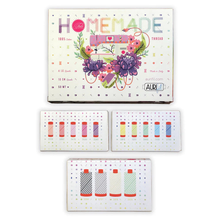 Homemade by Tula Pink, this collection was curated to coordinate with Tula's HomeMade fabric line. The Homemade 14 Spool Collection includes four large spools and ten small spools of thread. The thread is packaged beautifully in three custom-designed boxes! Each spool holds 50-weight Egyptian Cotton thread; the large spools have 1422 yards, while the small spools contain 220 yards. Colors include: (large spools) 5004, 6727, 2026, 2835, (small spools) 2220, 5002, 2479, 2535, 2528, 5015, 1231, 2860, 1320, 2730.