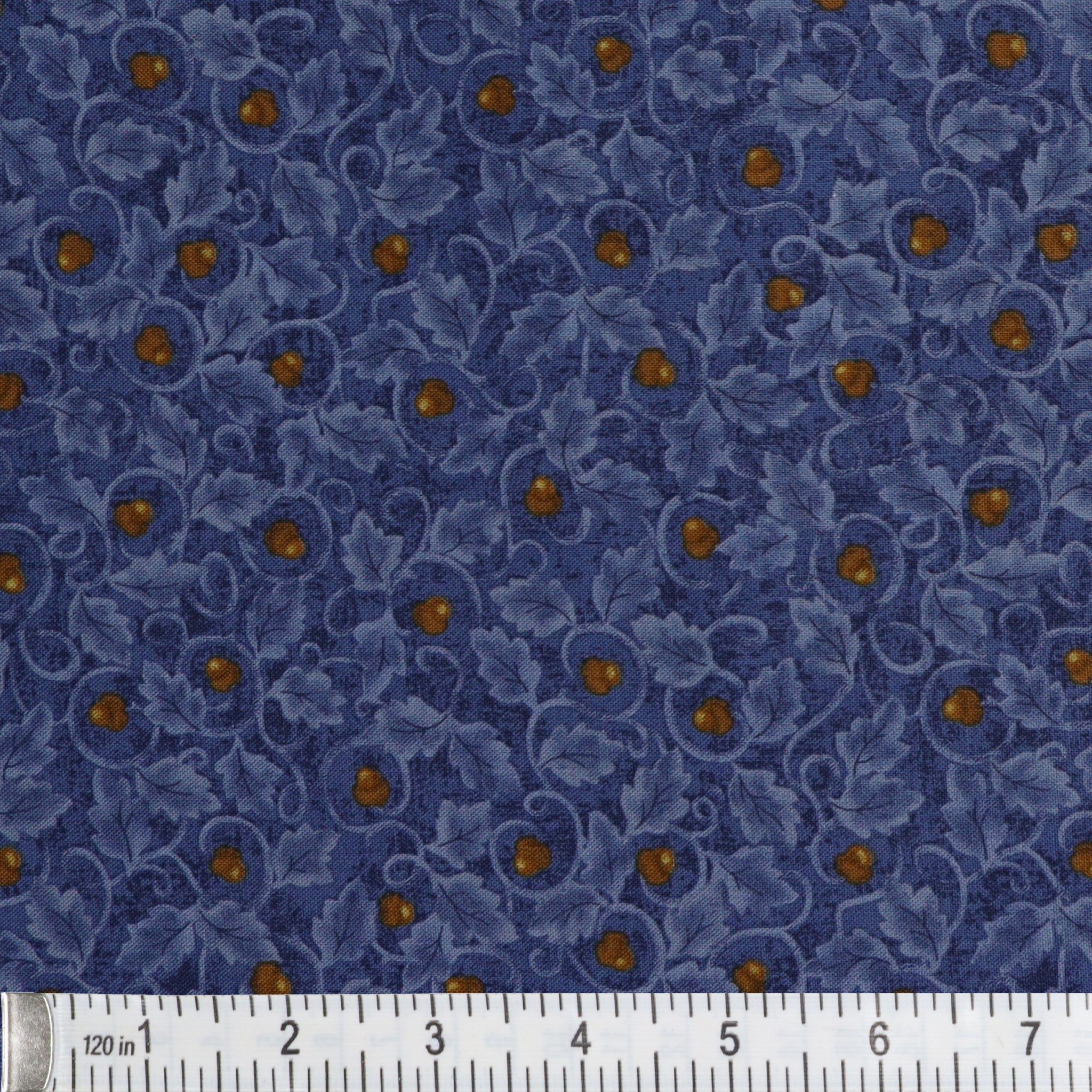 Moody and elegant, Acorn Twirl Blue evokes the serene beauty of a crisp, twilight forest. The deep denim-toned background is covered in swirling leafy vines that offer depth and movement, while golden-brown acorns dot the surface like hidden forest treasures. This rich blue fabric adds drama and dimension without sacrificing warmth, making it perfect for borders, star blocks, or grounding your favorite autumn palette. Whether you're stitching for the season or simply drawn to nature-inspired prints, Acorn Twirl Blue offers timeless charm with a refined touch.