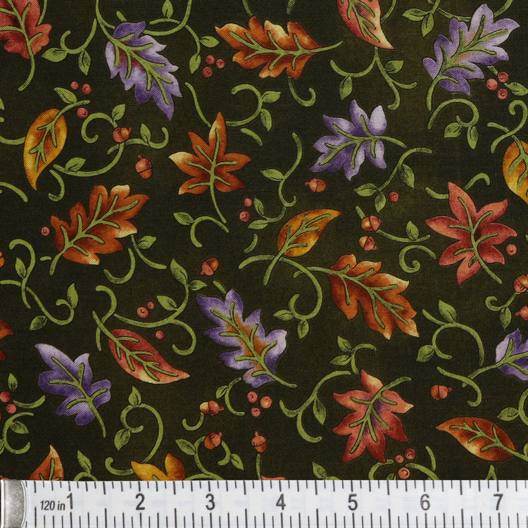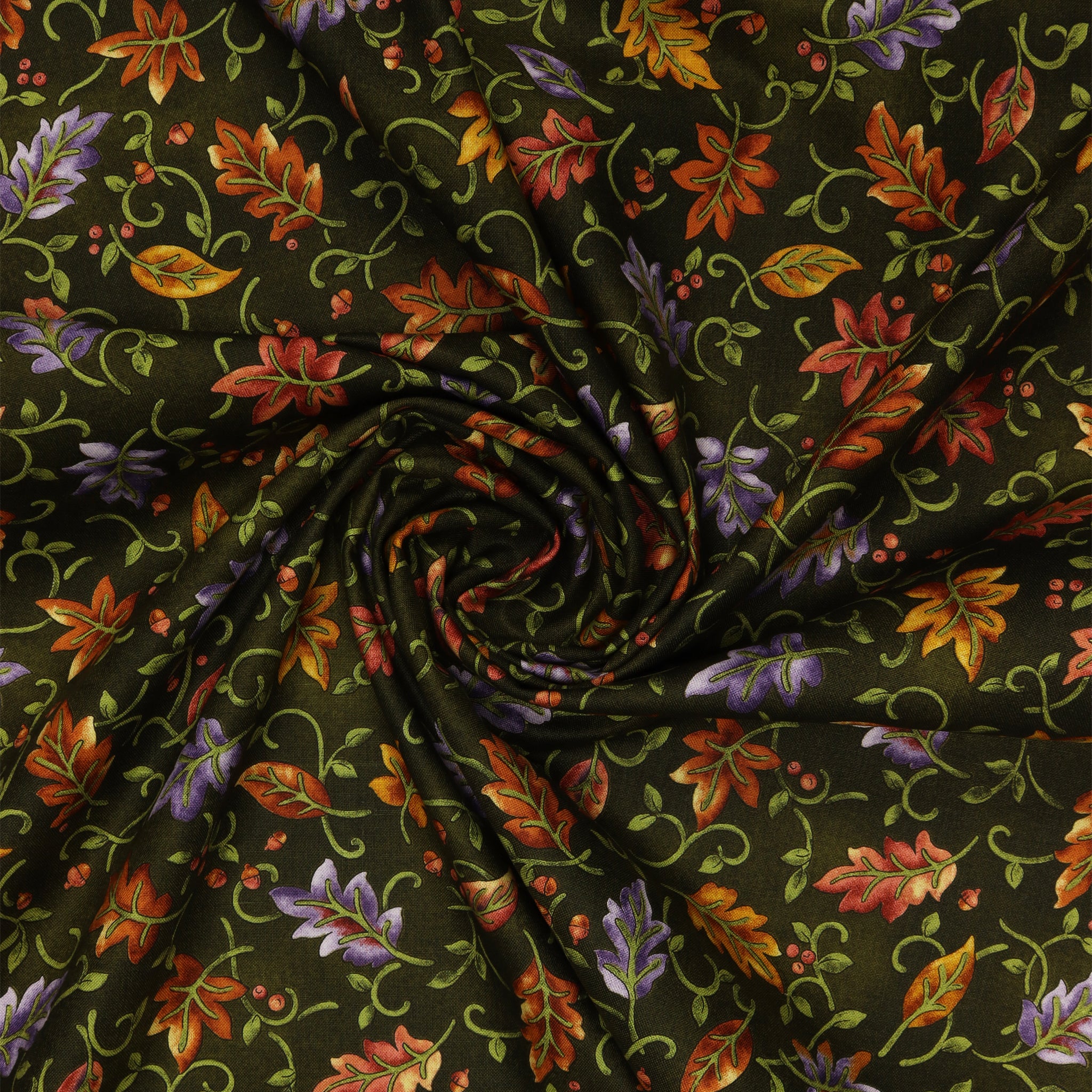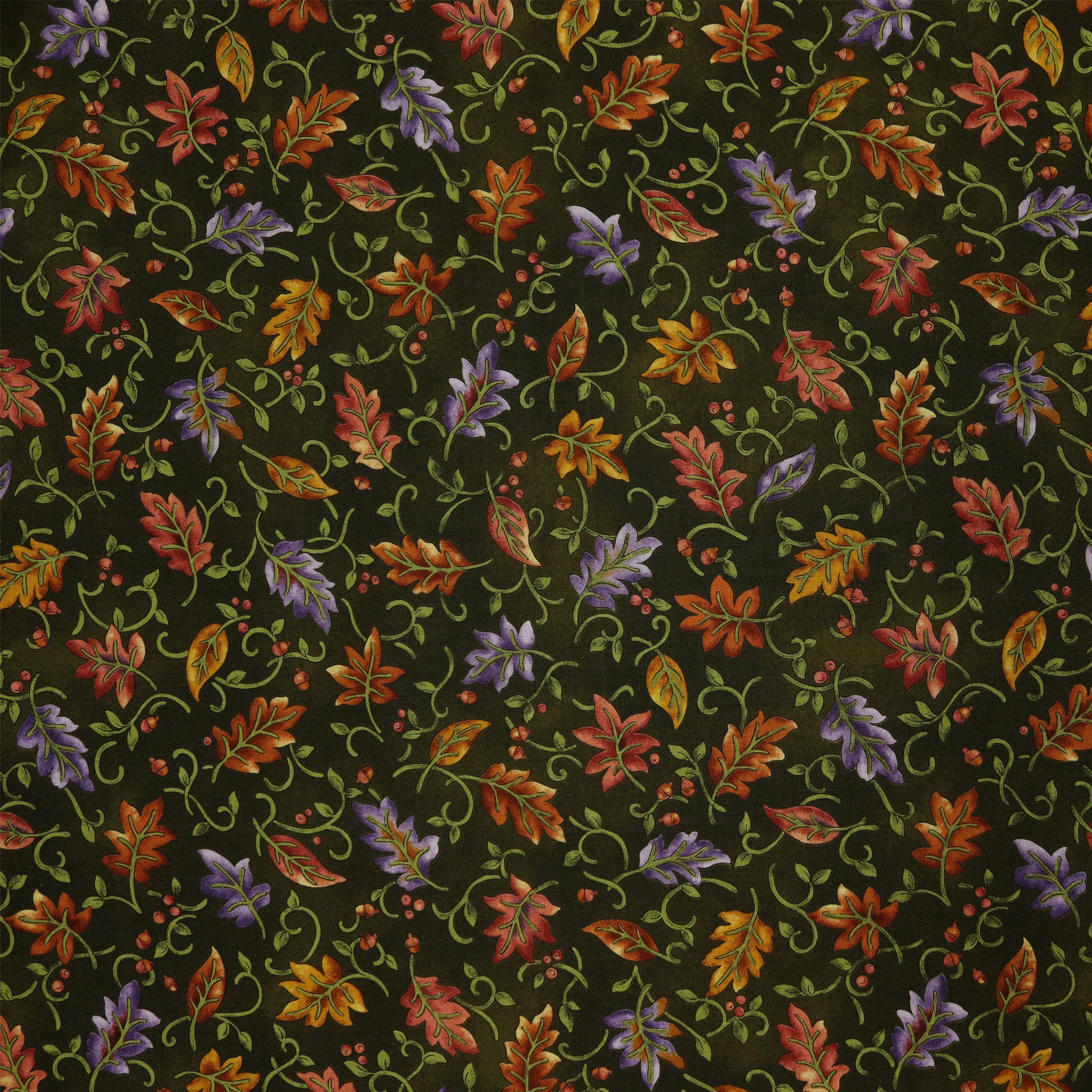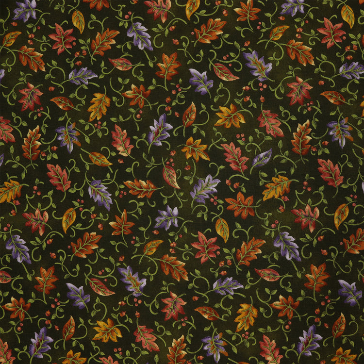 Rustic and grounding, the green Dancing Leaves print reflects the richness of autumn woodlands and winding trails. The deep olive base is lush and earthy, while the scattered leaves in mustard, orange, crimson, and soft purple weave together the season's most beloved tones. With its subtle texture and natural palette, this print works beautifully as a mixer or stand-alone feature. It's the perfect complement to brighter fall shades and lends a sense of balance and calm to busier projects. Ideal for forest-inspired quilts, Thanksgiving table décor, or cabin-themed accents, it brings the outdoors in with grace.