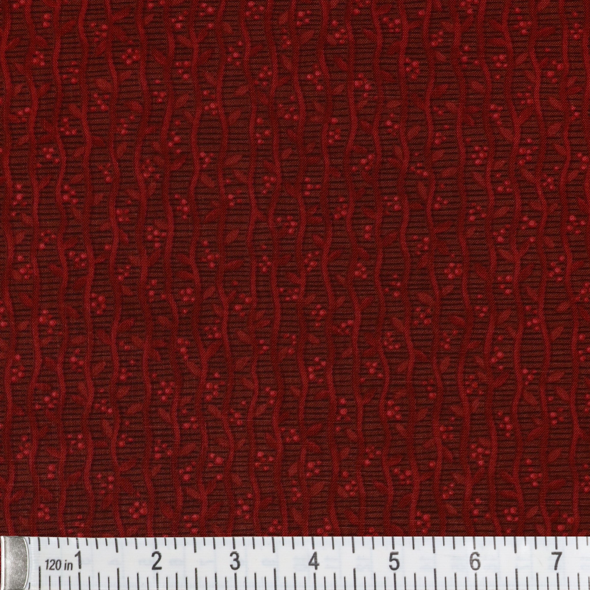 Harvest Stripe Red is a bold and beautiful tribute to fall's most iconic color. This rich red fabric is overlaid with a rhythmic vertical stripe pattern featuring organic, vine-like waves and finely etched lines that give it a modern yet natural flow. Tiny dot accents scattered throughout add a subtle shimmer, bringing the entire print to life. It's perfect for injecting warmth into autumn quilts, borders, or festive holiday sewing. Whether used as a feature fabric or a blender, this deep, cranberry-toned print brings cozy energy to any seasonal palette.