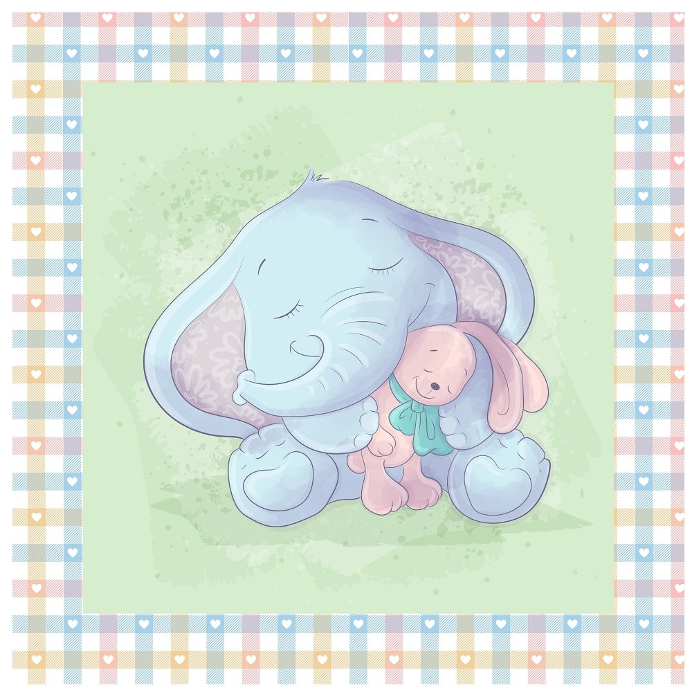 Baby Elephant With Rabbit Toy Fabric Panel - Green