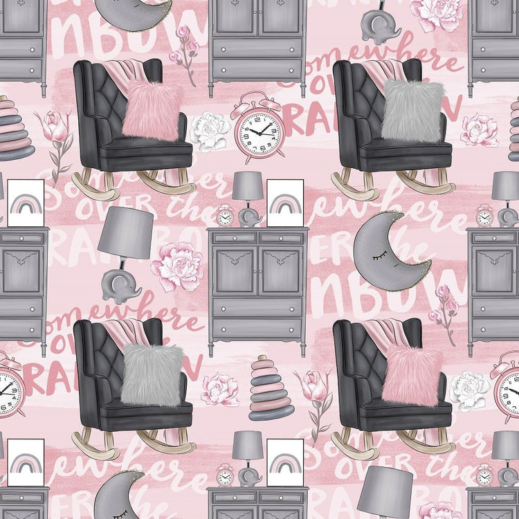 The Pink Baby Girl Nursery Elements Fabric is part of the Baby Girl Fabric Collection printed by Sew Creative Fabrics. Digitally Printed on 100% cotton.