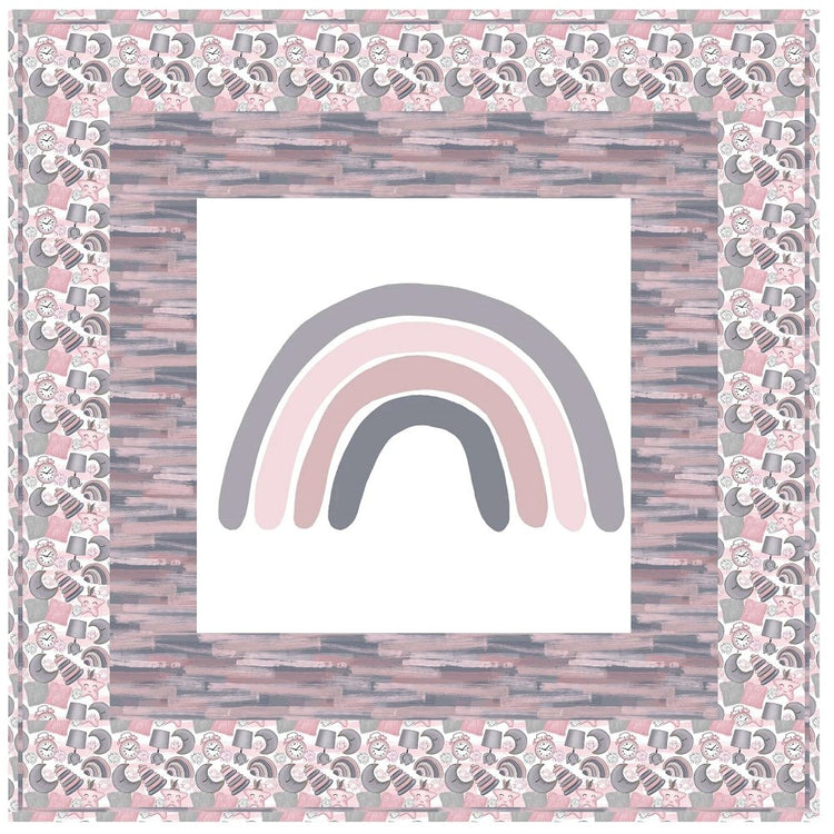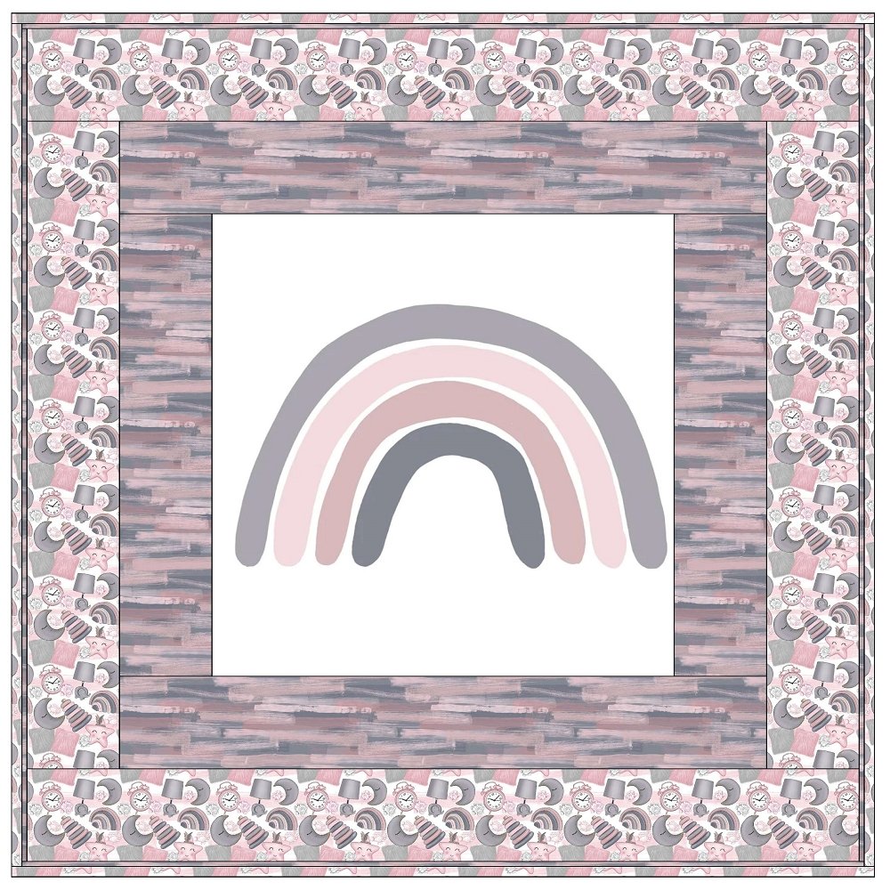 The Baby Girl Rainbow Wall Hanging includes everything that you need to make the quilt - the instructions and a total of 3 1/2 yards of fabric and a 23" panel. It has two borders and is finished with a flange binding. Batting is sold separately. The finished size of this quilt is 42" x 42".
