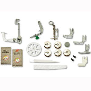 Flex-Reaction Foot, Free-Motion Quilting Foot, 1/4" Foot, Invisible Zipper Foot, Zipper Foot, Rolled Hem Foot, General Purpose Foot, Seam Guide, Screw, Bobbins, Needles, Knee Lifter, Feed Pin, Feed Pin Changer, Medium Screwdriver, Small Screwdriver, Cleaning Brush, Spool Caps, Spool Net, Spool Cone Holder, Extension Table, Foot Control, Soft Cover, and Instruction Manual.