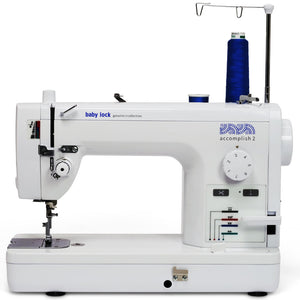The Baby Lock Accomplish 2 comes with a factory warranty, which gives you the ultimate piece of mind with your purchase. Your machine will be covered for 25 years to be free of defects in product casting due to imperfections in workmanship and materials. 10 years covers your machine from defective mechanical parts due to imperfections in workmanship and materials, excluding normally expendable parts. 2 years covers your machine from defects in the electrical equipment. 1 year covers it from defects in the electronic circuit boards and 1 year of free warranty labor by an Authorized Baby Lock Retailer.
