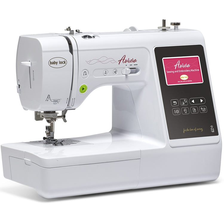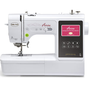Baby Lock's Aurora Embroidery & Sewing Machine is the perfect machine for those just starting to learn embroidery. This compact machine comes loaded with all the features you will need to help your embroidery skills thrive, including 303 embroidery designs, 191 stitches, 13 built-in fonts, a needle threader, a drop feed, a free arm, an extension table, and more. You can edit patterns directly on the LCD screen or create your own. The Aurora is Wi-Fi compatible, so you can wirelessly send your designs from a computer, use a jump drive, or Baby Lock's Design Database Transfer software. The Aurora can embroider up to 400 stitches per minute and 50,000 stitches in a single hooping, helping you finish projects faster, and the LED lighting on the machine ensures you do not miss a stitch. Start exploring all the creative possibilities you can accomplish with a BLMAR Sewing and Embroidery Machine today!