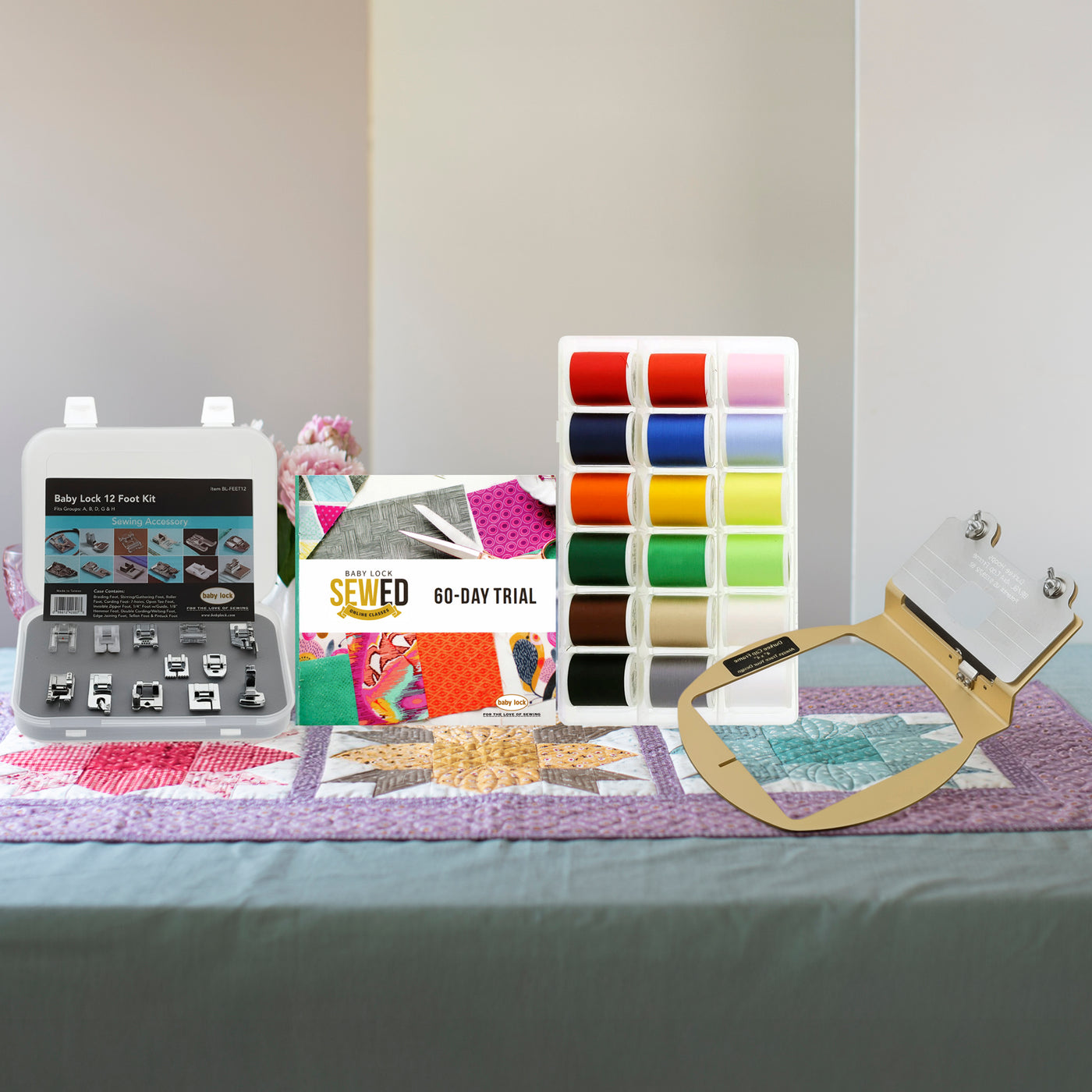 Kick off your sewing and embroidery journey with a thoughtfully curated FREE bonus bundle designed to give you versatility, convenience, and confidence right out of the box. This bundle includes the Small Embroidery Hoop (2.5" x 1"), perfect for monograms, labels, and delicate detail work on small projects. You'll also receive a 12-pack of Class 15 bobbins to keep your machine running smoothly, along with a 12-piece Sewing Foot Kit that opens the door to a wide range of techniques—from zippers and buttonholes to decorative stitching. To round it out, enjoy a 60-day trial of Baby Lock SewEd, giving you access to expert-led online classes that help you build skills and spark creativity at your own pace. Together, these essentials make it easy to learn, experiment, and sew with confidence from day one.