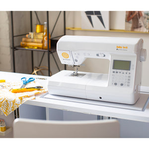 Remember to add your FREE bonus accessories, valued at $160. This nine-piece bundle includes a straight stitch needle plate, straight stitch foot, roller foot, open toe ruler foot, four packs of needs (80/12, 90/14, 100/16, 110/18), and a 60-day trial of Baby Lock SewEd online classes.